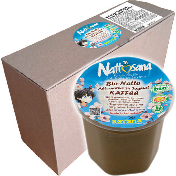 BioNATTO-Alternative zu Joghurt KAFFEE: WELTNEUHEIT von Soyana: SUPERFRISCH Jede Woche frisch NEU ab Januar 26 im BIOLADEN in der ganzen Schweiz VORBESTELL-ARTIKEL als 6er Karton zum TIEFPREIS von Fr. 3.30 pro Natto-Joghurt zu 250 g erhältlich oder einzeln NEU zu Fr. 3.90.