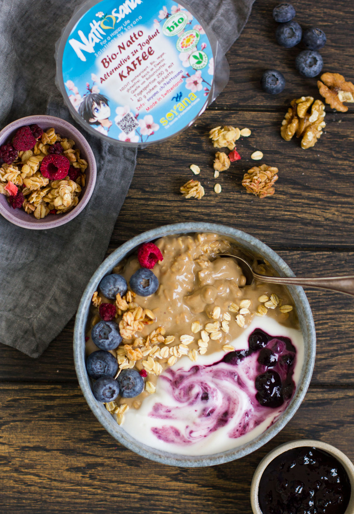 ODER Hafer über Nacht mit dem Joghurt ziehen lasen und das Natto erst am Morgen dazugeben.